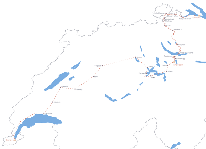 L'itinéraire, très accessible en fauteuil, longe d'abord le Lac de Constance vers Schaffhouse et ses fameuses chutes du Rhin. Puis l'île de Rheinau dédiée à la musique et son cloître baroque, ensuite c'est Winterthur, l'Oberland zurichois et Rapperswil, carrefour important des chemins suisses de Compostelle. Après une montée vers Feusisberg et le Pont du diable on touche au but : le monastère de Einsiedeln, où les gens viennent depuis le Moyen-Âge prier la Vierge noire. Cette étape a été inaugurée le 14 septembre 2024 avec cloches, bénédictions et bien évidemment, une grande fête !